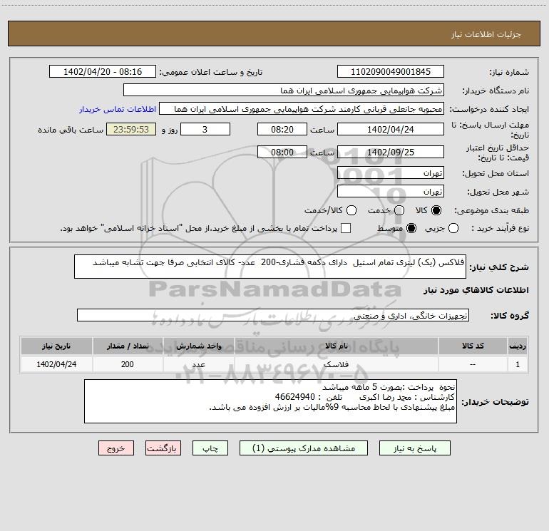شرح کلی نیاز: فلاکس (یک) لیتری تمام استیل دارای دکمه فشاری-200 عدد- کالای انتخابی صرفا جهت تشابه میباشد