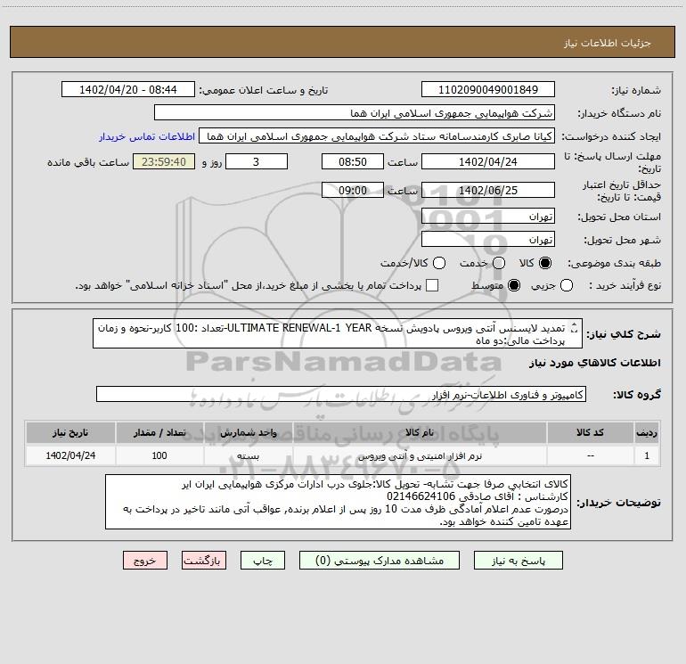 شرح کلی نیاز: تمدید لایسنس آنتی ویروس پادویش نسخه ULTIMATE RENEWAL-1 YEAR-تعداد :100 کاربر-نحوه و زمان پرداخت مالی:دو ماه