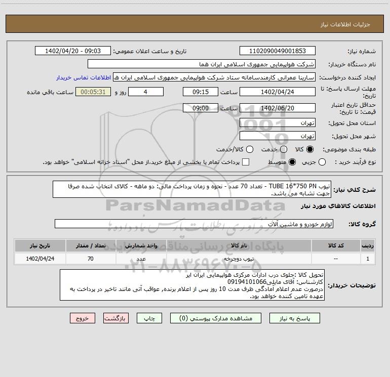 شرح کلی نیاز: تیوب TUBE 16*750 PN - تعداد 70 عدد - نحوه و زمان پرداخت مالی: دو ماهه - کالای انتخاب شده صرفا جهت تشابه می باشد.