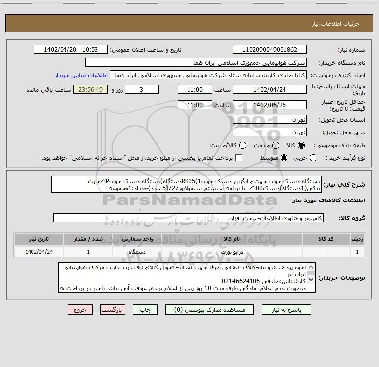 شرح کلی نیاز: دستگاه دیسک خوان جهت جایگزین دیسک خوانRK05(1دستگاه)دستگاه دیسک خوانZIPجهت یدکی(1دستگاه)دیسکZ100 با برنامه سیستم سیمولاتور727(5 عدد)-تعداد:1مجموعه