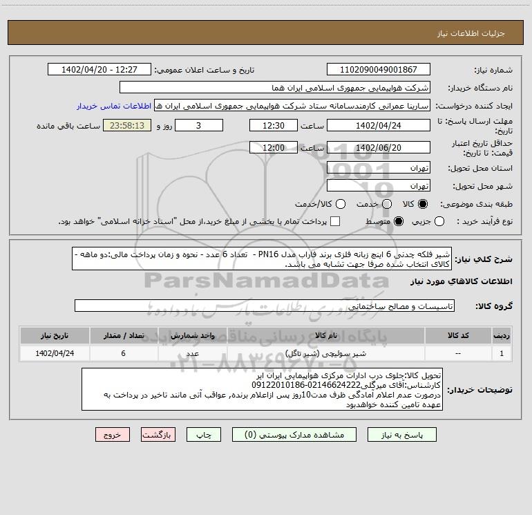 شرح کلی نیاز: شیر فلکه چدنی 6 اینچ زبانه فلزی برند فاراب مدل PN16 - تعداد 6 عدد - نحوه و زمان پرداخت مالی:دو ماهه - کالای انتخاب شده صرفا جهت تشابه می باشد.