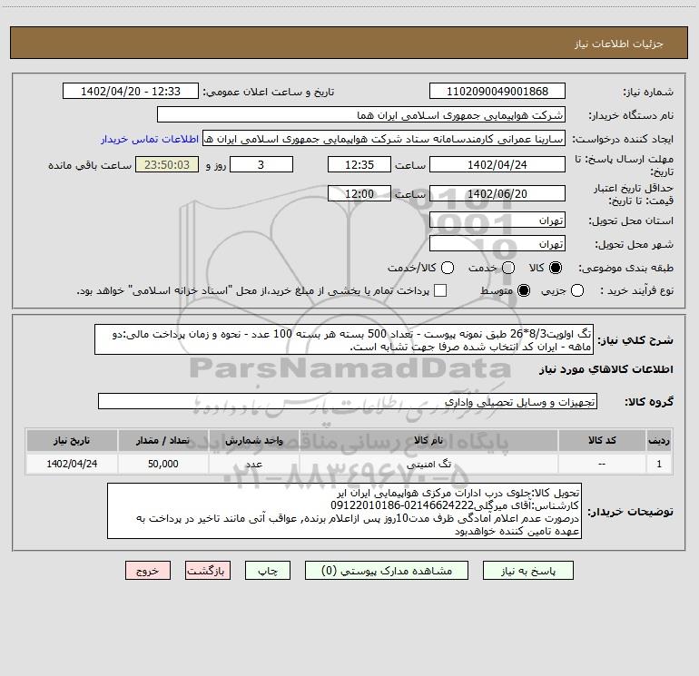 شرح کلی نیاز: تگ اولویت8/3*26 طبق نمونه پیوست - تعداد 500 بسته هر بسته 100 عدد - نحوه و زمان پرداخت مالی:دو ماهه - ایران کد انتخاب شده صرفا جهت تشابه است.