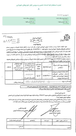 | انجام خدمات تعمیرات و سرویس سیستم سرمایشی خودروهای مجموعه شهرداری شیراز مطابق با شرح خدمات پیوست | 4.158.625.000 | 15 ماه |