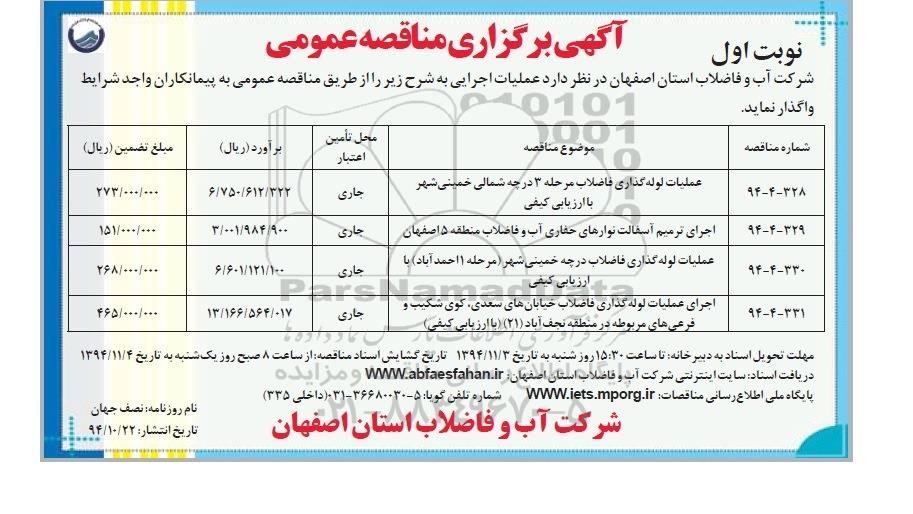 شرکت آب و فاضلاب استان اصفهان در نظر دارد عملیات اجرایی به شرح زیر را از طریق مناقصه عمومی به پیمانکاران واجد شرایط واگذار نماید.