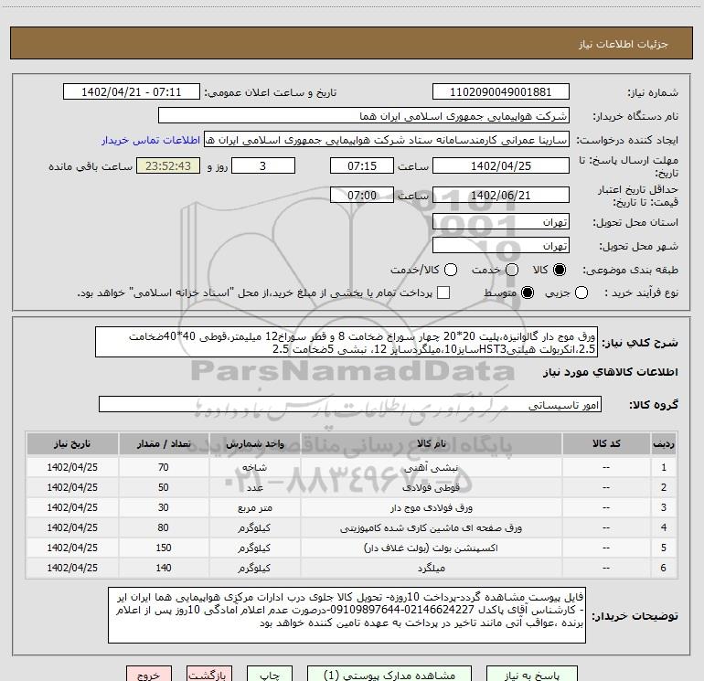 شرح کلی نیاز: ورق موج دار گالوانیزه،پلیت 20*20 چهار سوراخ ضخامت 8 و قطر سوراخ12 میلیمتر،قوطی 40*40ضخامت 2.5،انکربولت هیلتیHST3سایز10،میلگردسایز 12، نبشی 5ضخامت 2.5