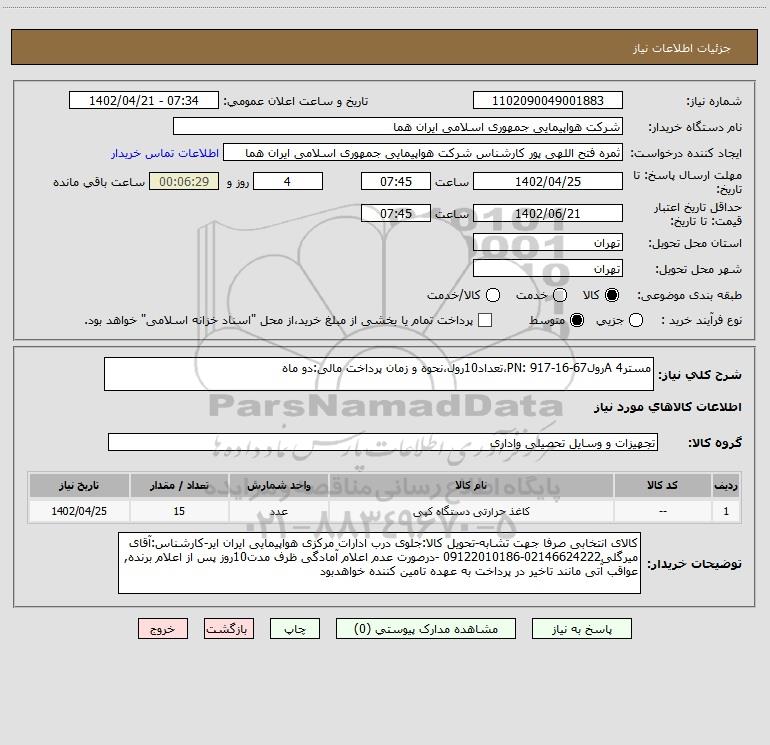 شرح کلی نیاز: مسترA 4رولPN: 917-16-67،تعداد10رول،نحوه و زمان پرداخت مالی:دو ماه