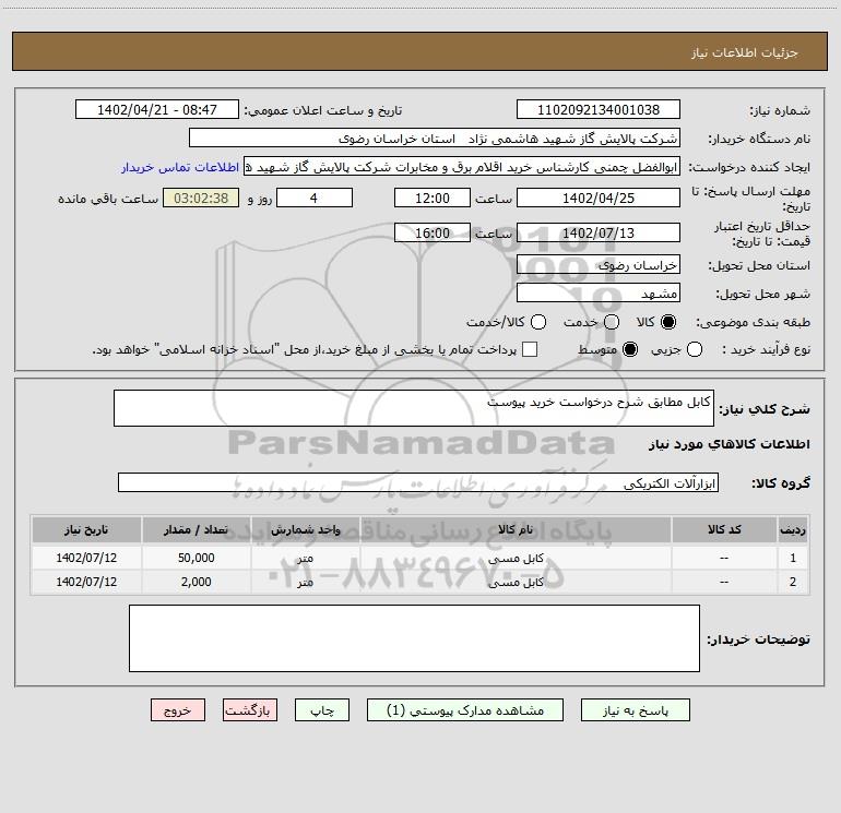 شرح کلی نیاز: کابل مطابق شرح درخواست خرید پیوست