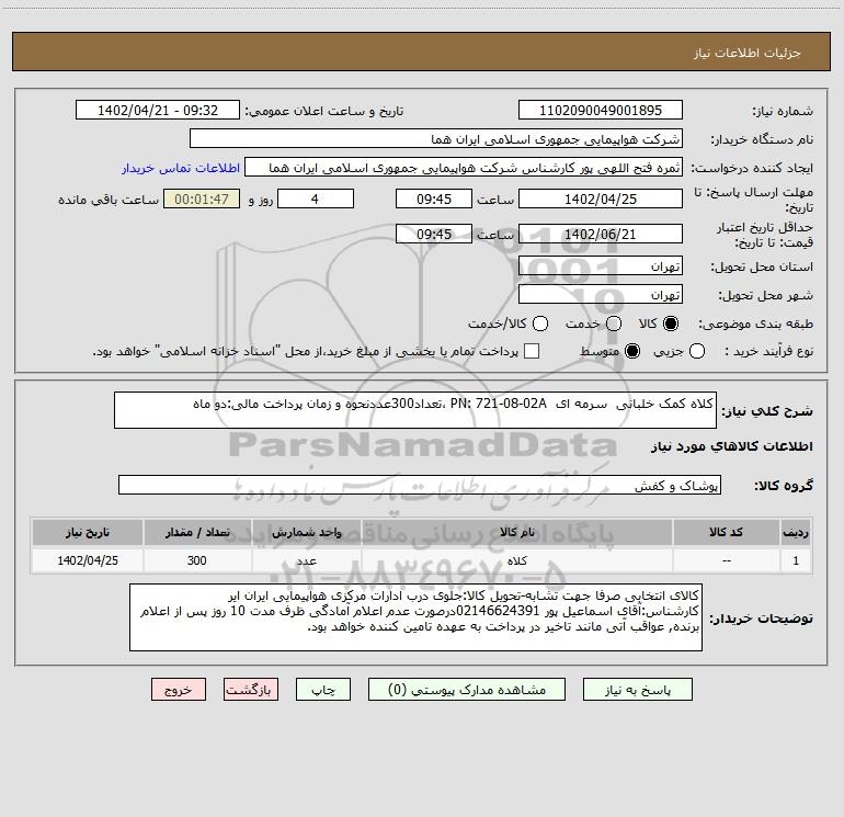 شرح کلی نیاز: کلاه کمک خلبانی سرمه ای PN: 721-08-02A ،تعداد300عددنحوه و زمان پرداخت مالی:دو ماه