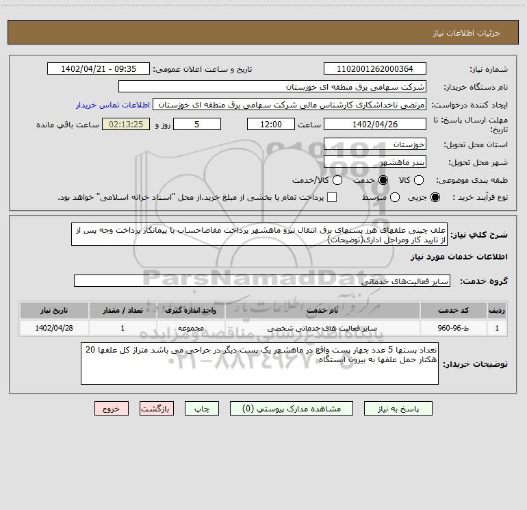 توضیحات خریدار:تعداد پستها 5 عدد چهار پست واقع در ماهشهر یک پست دیگر در جراحی می باشد متراژ کل علفها 20 هکتار حمل علفها به بیرون ایستگاه