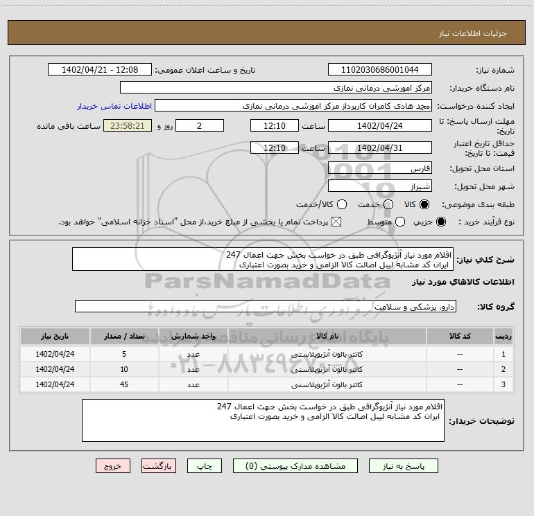شرح کلی نیاز: اقلام مورد نیاز آنژیوگرافی طبق در خواست بخش جهت اعمال 247