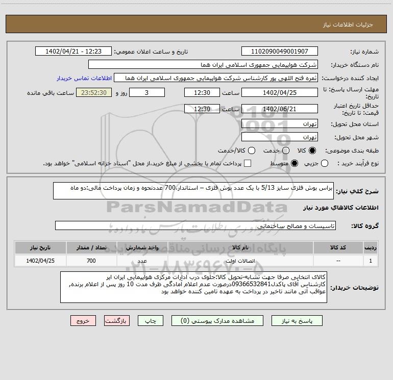 توضیحات خریدار:کالای انتخابی صرفا جهت تشابه-تحویل کالا:جلوی درب ادارات مرکزی هواپیمایی ایران ایر کارشناس آقای پاکدل09366532841درصورت عدم اعلام آمادگی ظرف مدت 10 روز پس از اعلام برنده, عواقب آتی مانند تاخیر در پرداخت به عهده تامین کننده خواهد بود