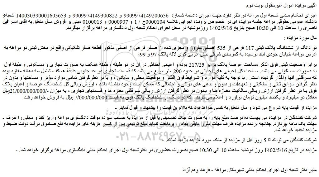 دو دانگ از ششدانگ پلاک ثبتی 117 فرعی از 535 اصلی مفروز و مجزی شده از صفر فرعی از اصلی مذکور قطغه صفر تفکیکی واقع در بخش ثبتی دو مراغه به آدرس مراغه خیابان جودی آباد نرسیده به کمربندی شرقی نبش غربی کوی لاله پلاک 97 و 99،