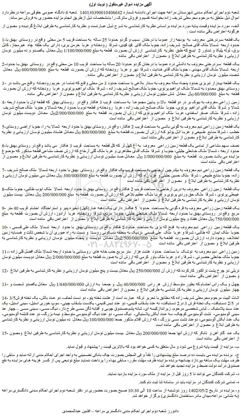 شعبه دوم اجرای احکام مدنی شهرستان مراغه جهت اجرای دادنامه شماره 140130390010406642 شعبه 6 دادگاه عمومی حقوقی مراغه درنظردارد اموال ذیل متعلق به مرحوم محرمعلی شریف زاده بخواسته تقسیم و فروش ماترک را بامشخصات ذیل ازطریق انجام مزایده حضوری به فروش میرساند:
