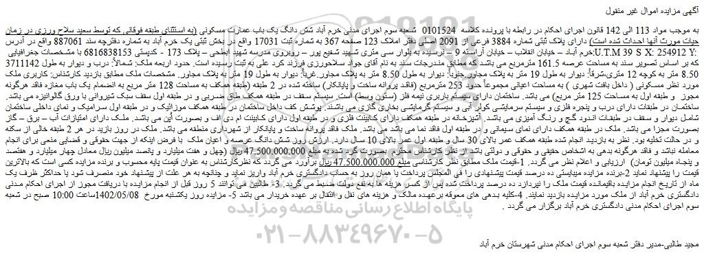 به موجب مواد 113 الی 142 قانون اجرای احکام در رابطه با پرونده کلاسه 0101524 شعبه سوم اجرای مدنی خرم آباد شش دانگ یک باب عمارت مسکونی (به استثنای طبقه فوقانی که توسط سعید سلاح ورزی در زمان حیات مورث آنها احداث شده است) دارای پلاک ثبتی شماره 3884 فرعی از 2091 اصلی دفتر املاک 123 صفحه 367 به شماره ثبت 17031 واقع در بخش ثبتی یک خرم آباد به شماره دفترچه سند 887061 واقع در آدرس :خرم آباد – خیابان انقلاب – خیابان آراسته 9 – نرسیده به بلوار سی متری شهید شفیع پور – روبروی مدرسه شهید ابطحی – پلاک 173 - کدپستی 6816838153 با مشخصات جغرافیایی U.T.M 39 S X: 254912 Y: 3711142 که بر اساس تصویر سند به مساحت عرصه 161.5 مترمربع می باشد که مطابق مندرجات سند به نام آقای جواد سلاحورزی فرزند کرد علی به ثبت رسیده است. حدود اربعه ملک: شمالاً: درب و دیوار به طول 8.50 متر به کوچه 12 متری،شرقاً: دیوار به طول 19 متر به پلاک مجاور.جنوباً: دیوار به طول 8.50 متر به پلاک مجاور.غرباً: دیوار به طول 19 متر به پلاک مجاور. مشخصات ملک مطابق بازدید کارشناس: کاربری ملک مورد نظر مسکونی ( داخل بافت شهری ) به مساحت اعیانی مجموعاً حدود 253 مترمربع (فاقد پروانه ساخت و پایانکار) ساخته شده در 2 طبقه (طبقه همکف به مساحت 128 متر مربع به انضمام یک باب مغازه فاقد هرگونه مجوز و طبقه اول به مساحت 125 متر مربع) می باشد. ساختمان دارای سیستم باربری نیمه فلز (ستون وسط) است. سیستم سقف در طبقه همکف طاق ضربی و در طبقه اول سقف سبک شیروانی با ورق گالوانیزه می باشد. ساختمان در طبقات دارای درب و پنجره فلزی و سیستم سرمایشی کولر آبی و سیستم گرمایشی بخاری گازی می باشند. پوشش کف داخل ساختمان در طبقه همکف موزائیک و در طبقه اول سرامیک و نمای داخلی ساختمان شامل دیوار و سقف در طبقات اندود گچ و رنگ آمیزی می باشد. آشپزخانه در طبقه همکف دارای کابینت فلزی و در طبقه اول دارای کابینت ام دی اف و بصورت اُپن می باشد. ملک دارای امتیازات آب – برق – گاز بصورت مجزا می باشد. ملک در طبقه همکف دارای نمای سیمانی و در طبقه اول فاقد نما می باشد می باشد. ملک فاقد پروانه ساخت و پایانکار از شهرداری منطقه می باشد. ملک در روز بازید در هر 2 طبقه خالی از سکنه و در حالت تخلیه بود. نظر به بازدید انجام شده طبقه همکف عمر بالای 30 سال و طبقه اول عمر بالای 10 سال دارد. ارزش روز شش دانگ عرصه و اعیان ملک با فرض اینکه از جهت حقوقی و قضایی منعی برای انجام معامله نباشد و فاقد هرگونه بدهی به اشخاص حقیقی و حقوقی و دولتی باشد از نظر کارشناس محترم بصورت گرد شده به مبلغ 47.500.000.000 ریال (چهل و هفت میلیارد و پانصد میلیون ریال معادل چهار میلیارد و هفتصد و پنجاه میلیون تومان) ارزیابی و اعلام نظر می گردد. 1-قیمت ملک مطابق نظر کارشناسی مبلغ 47.500.000.000 ریال برآورد می گردد که نظرکارشناس به عنوان قیمت پایه محسوب و برنده مزایده کسی است که بالاترین قیمت را پیشنهاد نماید 2-برنده مزایده میبایستی ده درصد قیمت پیشنهادی را فی المجلس پرداخت یا همان روز به حساب دادگستری خرم آباد واریز نماید و چنانچه به هر علت از پیشنهاد خود منصرف شود یا حداکثر ظرف یک ماه از تاریخ انجام مزایده باقیمانده قیمت ملک را نپردازد ده درصد پرداخت شده پس از کسر هزینه ها به نفع دولت ضبط می گردد. 3- طالبین می توانند 5 روز قبل از انجام مزایده با دریافت مجوز از اجرای احکام مدنی دادگستری خرم آباد از ملک مورد مزایده بازدید نمایند. 4-کلیه بدهی های معوقه برعهده مالک و هزینه های نقل و انتقال بر عهده خریدار می باشد 5- مزایده روز یکشنبه مورخ 1402/05/08ساعت 10:00 صبح در شعبه سوم اجرای احکام مدنی دادگستری خرم آباد برگزار می گردد .