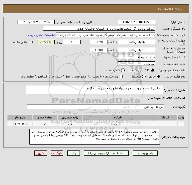 نام دستگاه خریدار:شرکت پالایش گاز شهید هاشمی نژاد استان خراسان رضوی