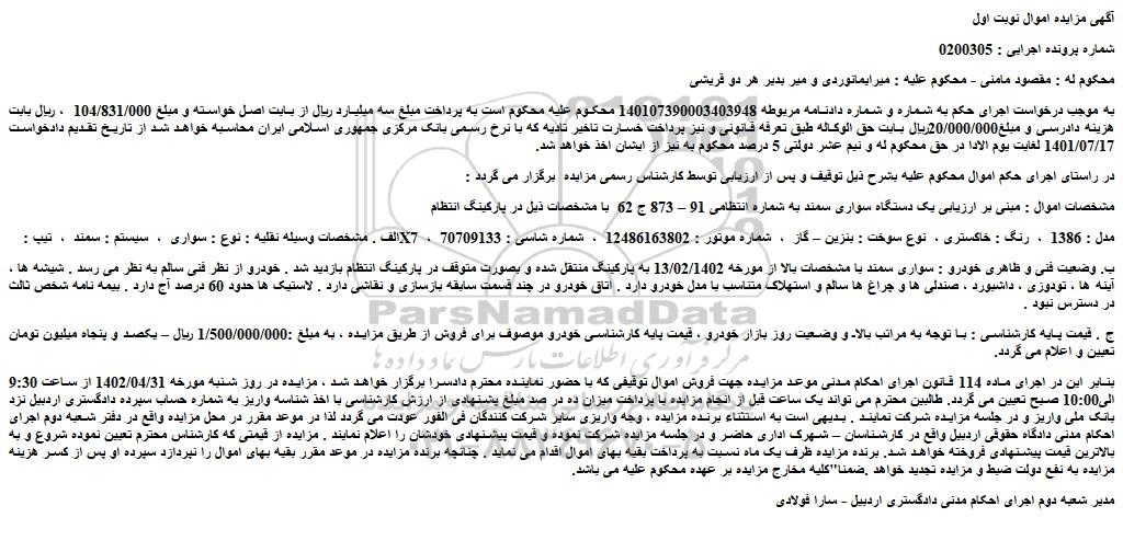 بنابر این در اجرای ماده 114 قانون اجرای احکام مدنی موعد مزایده جهت فروش اموال توقیفی که با حضور نماینده محترم دادسرا برگزار خواهد شد ، مزایده در روز شنبه مورخه 1402/04/31 از ساعت 9:30 الی10:00 صبح تعیین می گردد. طالبین محترم می تواند یک ساعت قبل از انجام مزایده با پرداخت میزان ده در صد مبلغ پشنهادی از ارزش کارشناسی با اخذ شناسه واریز به شماره حساب سپرده دادگستری اردبیل نزد بانک ملی واریز و در جلسه مزایده شرکت نمایند . بدیهی است به استثناء برنده مزایده ، وجه واریزی سایر شرکت کنندگان فی الفور عودت می گردد لذا در موعد مقرر در محل مزایده واقع در دفتر شعبه دوم اجرای احکام مدنی دادگاه حقوقی اردبیل واقع در کارشناسان – شهرک اداری حاضر و در جلسه مزایده شرکت نموده و قیمت پیشنهادی خودشان را اعلام نمایند . مزایده از قیمتی که کارشناس محترم تعیین نموده شروع و به بالاترین قیمت پیشنهادی فروخته خواهد شد. برنده مزایده ظرف یک ماه نسبت به پرداخت بقیه بهای اموال اقدام می نماید . چنانچه برنده مزایده در موعد مقرر بقیه بهای اموال را نپردازد سپرده او پس از کسر هزینه مزایده به نفع دولت ضبط و مزایده تجدید خواهد .ضمنا"کلیه مخارج مزایده بر عهده محکوم علیه می باشد.