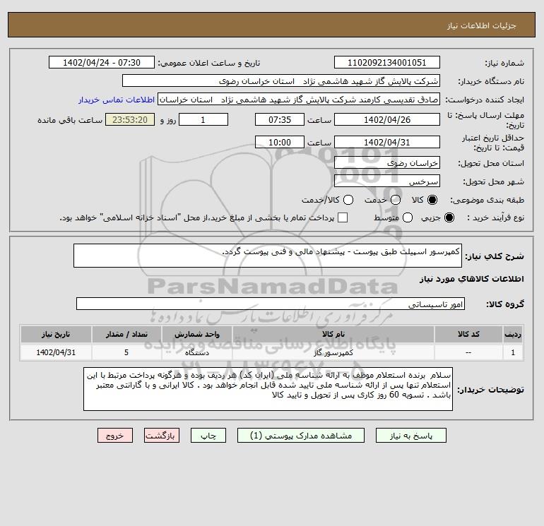 نام دستگاه خریدار:شرکت پالایش گاز شهید هاشمی نژاد استان خراسان رضوی