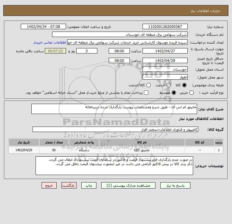 شرح کلی نیاز: مانیتور ام اس آی - طبق شرح ومشخصات پیوست بارگذاری شده درسامانه