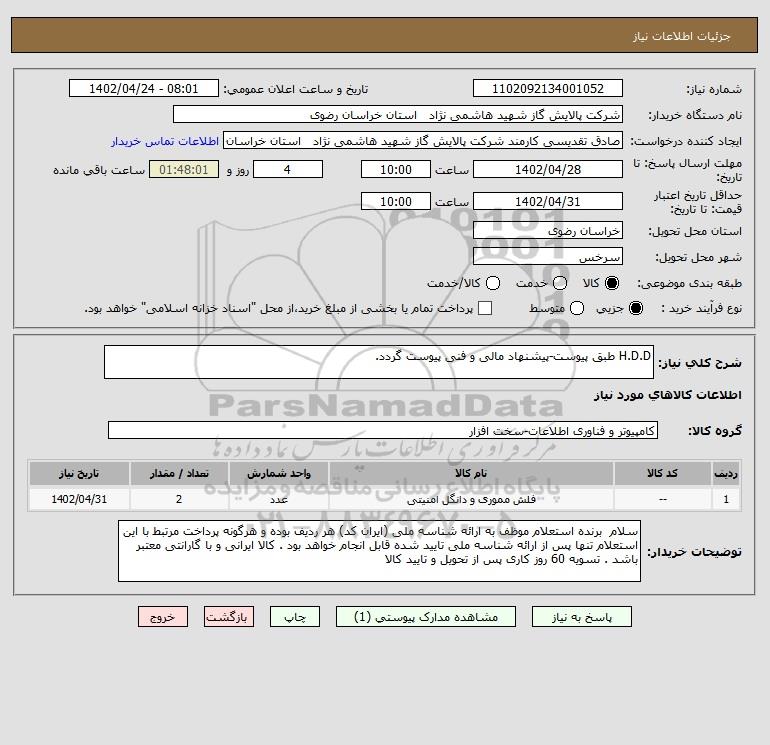 شرح کلی نیاز: H.D.D طبق پیوست-پیشنهاد مالی و فنی پیوست گردد.