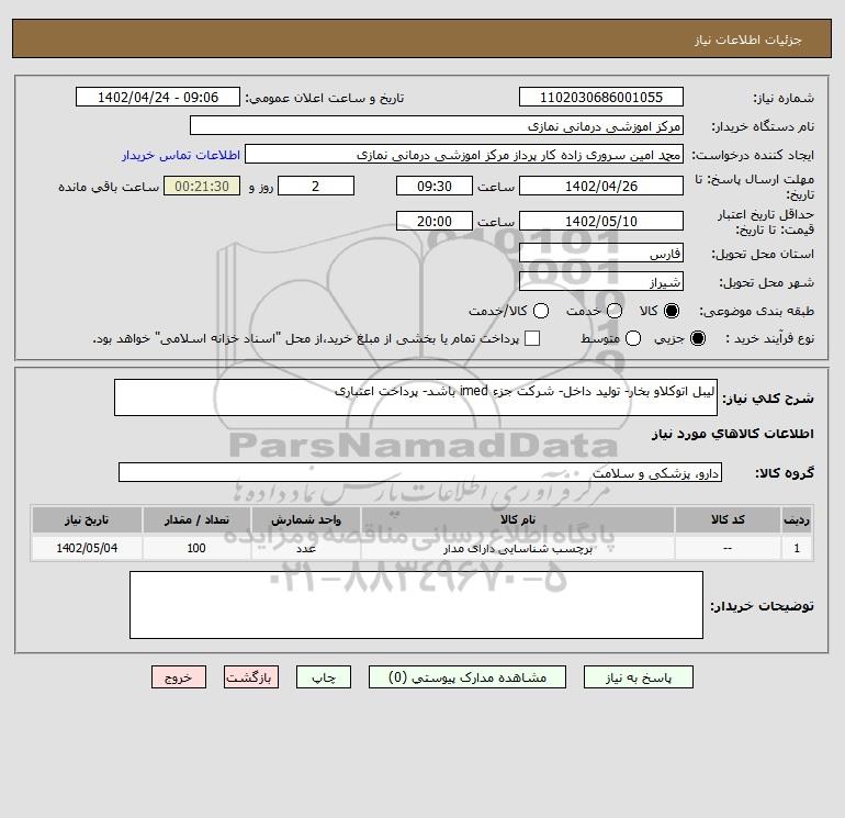 شرح کلی نیاز: لیبل اتوکلاو بخار- تولید داخل- شرکت جزء imed باشد- پرداخت اعتباری
