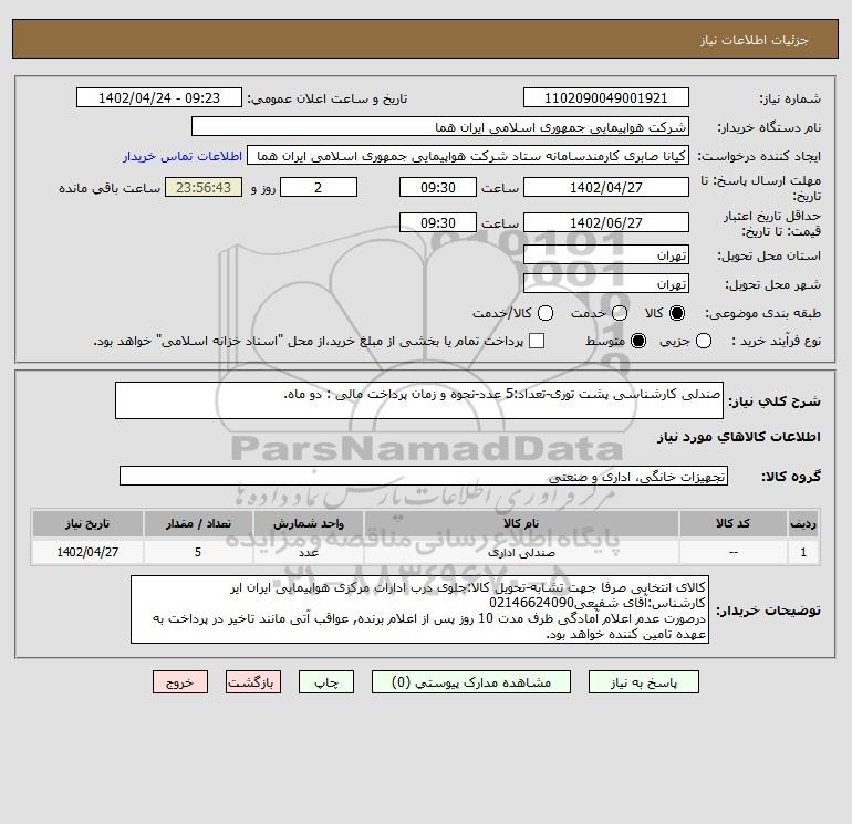 شرح کلی نیاز: صندلی کارشناسی پشت توری-تعداد:5 عدد-نحوه و زمان پرداخت مالی : دو ماه.