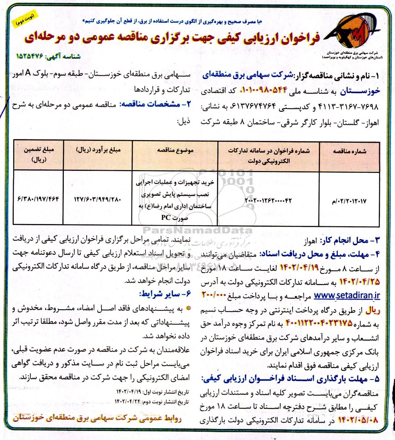 فراخوان ارزیابی کیفی مناقصه خرید تجهیزات و عملیات اجرایی نصب سیستم پایش تصویری - نوبت دوم از کلیه افراد متخصص و شرکتها واجد شرایط دعوت به عمل میآید در مناقصه با کد خبرگزاری پارس نماد: 6087983 شرکت نمایند.
