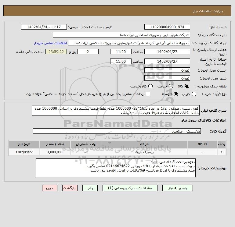 شرح کلی نیاز: کفی سینی صدفی 1/2 در ابعاد 16.5*23- 1000000 عدد- لطفا قیمت پیشنهادی بر اساس 1000000 عدد باشد ،کالای انتخاب شده صرفا جهت تشابه میباشد