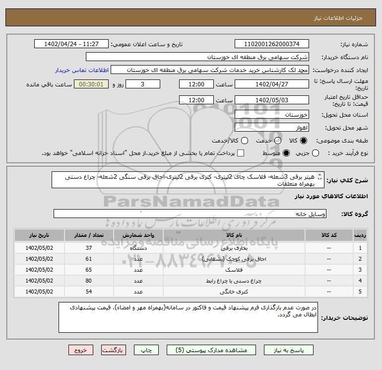 شرح کلی نیاز: هیتر برقی 3شعله- فلاسک چای 2لیتری- کتری برقی 2لیتری-اجاق برقی سنگی 2شعله- چراغ دستی بهمراه متعلقات