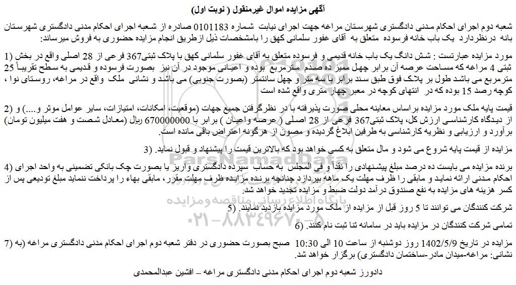 شعبه دوم اجرای احکام مدنی دادگستری شهرستان مراغه جهت اجرای نیابت شماره 0101183 صادره از شعبه اجرای احکام مدنی دادگستری شهرستان بانه درنظردارد یک باب خانه فرسوده متعلق به آقای غفور سلمانی کهق را بامشخصات ذیل ازطریق انجام مزایده حضوری به فروش میرساند: