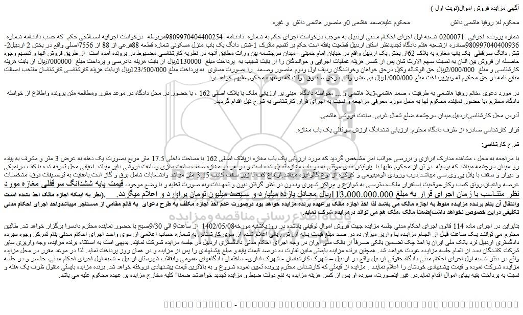 شماره پرونده اجرایی 0200071 شعبه اول اجرای احکام مدنی اردبیل به موجب درخواست اجرای حکم به شماره دادنامه 9809970404400254مربوطه درخواست اجراییه اصلاحی حکم که حسب دادنامه شماره 980997040400936صادره ازشعبه هفتم دادگاه تجدیدنظر استان اردبیل قطعیت یافته است حکم بر تقسیم ماترک 1-شش دانگ یک باب منزل مسکونی شماره قطعه 88فرعی از 88 از 7556اصلی واقع در بخش 2 اردبیل2- شش دانگ سرقفلی یک باب مغازه به پلاک 62از بخش یک اردبیل واقع در خیابان امام خمینی –میدان سرچشمه بین وراث مطابق آنچه در نظریه کارشناسی مضبوط در پرونده آمده است از طریق فروش آنها و تقسیم وجوه حاصله از فروش بین آنان به نسبت سهم الارث شان پس از کسر هزینه عملیات اجرایی و خواندگان را از بابت تسبیب به پرداخت مبلغ 1130000ریال از بابت هزینه دادرسی و پرداخت مبلغ 7000000ریال از بابت هزینه کارشناسی و مبلغ 2/000/000ریال حق الوکاله وکیل درحق خواهان وخواندگان ردیف اول ودوم منصور وصمد را بصورت مساوی به پرداخت مبلغ 123/500/000ریال ازبابت هزینه کارشناسی کارشناسان منتخب اصالت مبایع نامه در حق محکوم له ونیزپرداخت مبلغ 1/000/000ریال نیم عشردولتی درحق صندوق دولت که برعهده محکوم علیهم خواهد بود