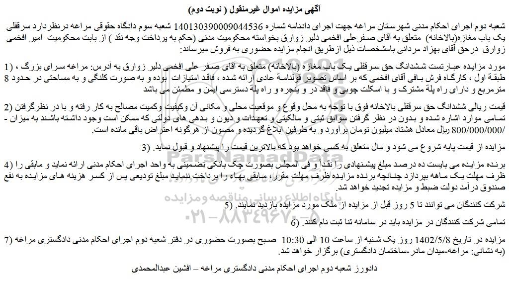 شعبه دوم اجرای احکام مدنی شهرستان مراغه جهت اجرای دادنامه شماره 140130390009044536 شعبه سوم دادگاه حقوقی مراغه درنظردارد سرقفلی یک باب مغازه(بالاخانه) متعلق به آقای صفرعلی افخمی دلیر زوارق بخواسته محکومیت مدنی (حکم به پرداخت وجه نقد ) از بابت محکومیت امیر افخمی زوارق درحق آقای بهزاد مردانی بامشخصات ذیل ازطریق انجام مزایده حضوری به فروش میرساند: