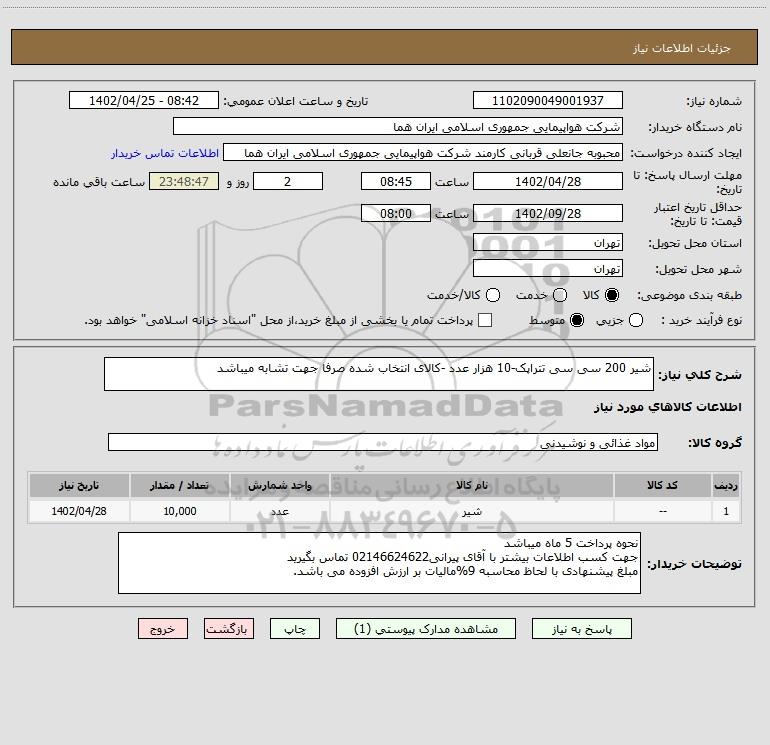 شرح کلی نیاز: شیر 200 سی سی تتراپک-10 هزار عدد -کالای انتخاب شده صرفا جهت تشابه میباشد