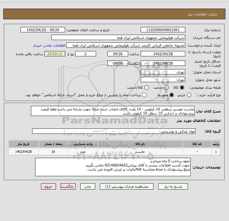 شرح کلی نیاز: ماست موسیر سطلی 10 کیلویی - 10 عدد- کالای انتخاب شده صرفا جهت تشابه می باشد.لطفا قیمت پیشنهادی بر اساس 10 سطل 10 کیلویی باشد