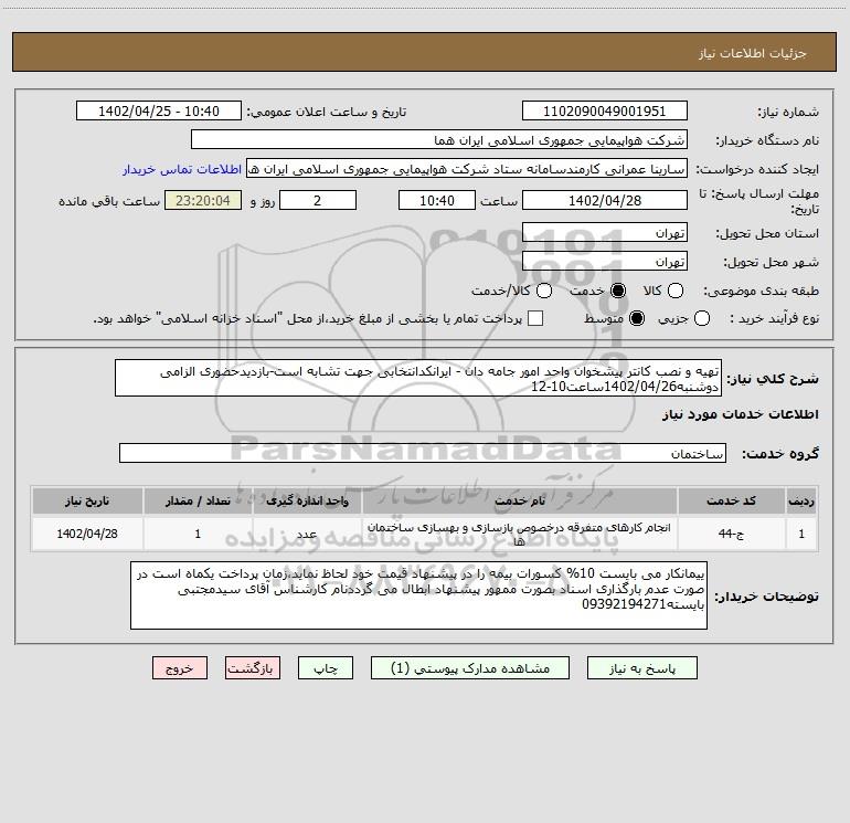 شرح کلی نیاز: تهیه و نصب کانتر پیشخوان واحد امور جامه دان - ایرانکدانتخابی جهت تشابه است-بازدیدحضوری الزامی دوشنبه1402/04/26ساعت10-12