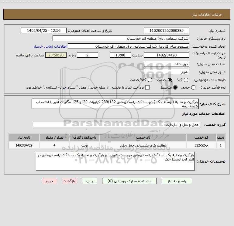 توضیحات خریدار:بارگیری وتخلیه یک دستگاه ترانسفورماتور در پست اهواز 1 و بارگیری و تخلیه یک دستگاه ترانسفورماتور در انبار فجر توسط جک