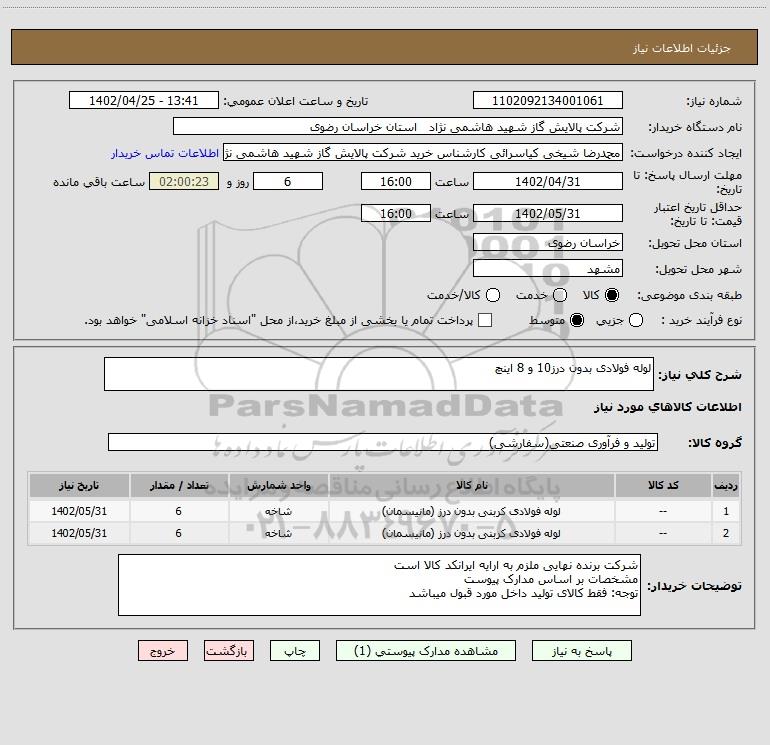 شرح کلی نیاز: لوله فولادی بدون درز10 و 8 اینچ
