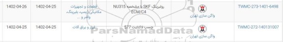 | TWMC -273- 1401-6498 | واگن سازی تهران | رولبرینگ skf با مشخصه nu315 ecm/c4 | قطعات و تجهیزات مکانیکی (پمپ، بلبرینگ، واشر و...) | 1402.4.26 |