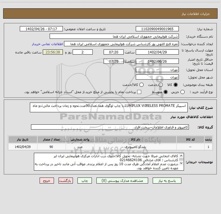 شرح کلی نیاز: اسپیکر LUMIFLUX WIRELESS PROMATE،با چاپ لوگوی هما،تعداد90عدد،نحوه و زمان پرداخت مالی:دو ماه