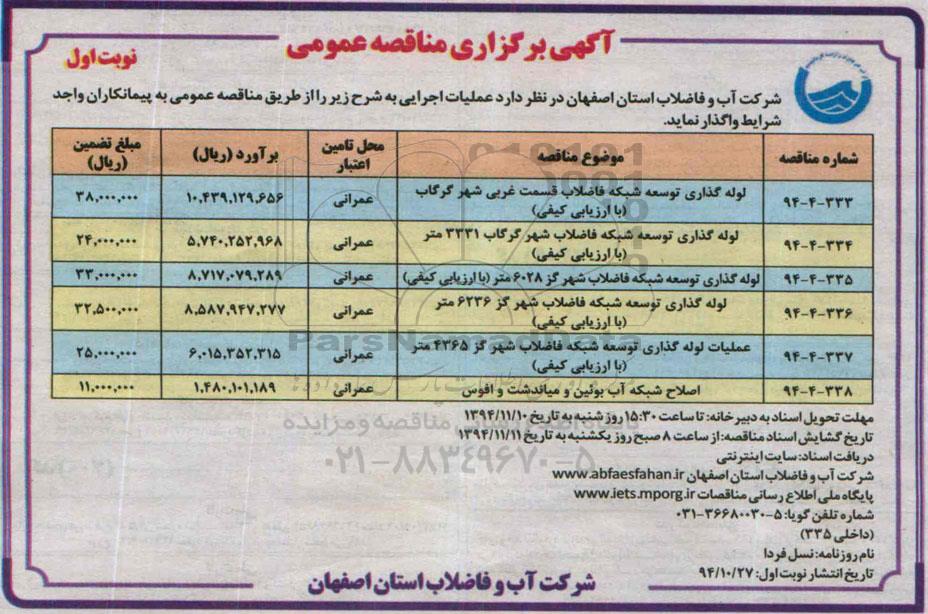 شرکت آب و فاضلاب استان اصفهان در نظر دارد عملیات اجرایی به شرح زیر را از طریق مناقصه عمومی به پیمانکاران واجد شرایط واگذار نماید.