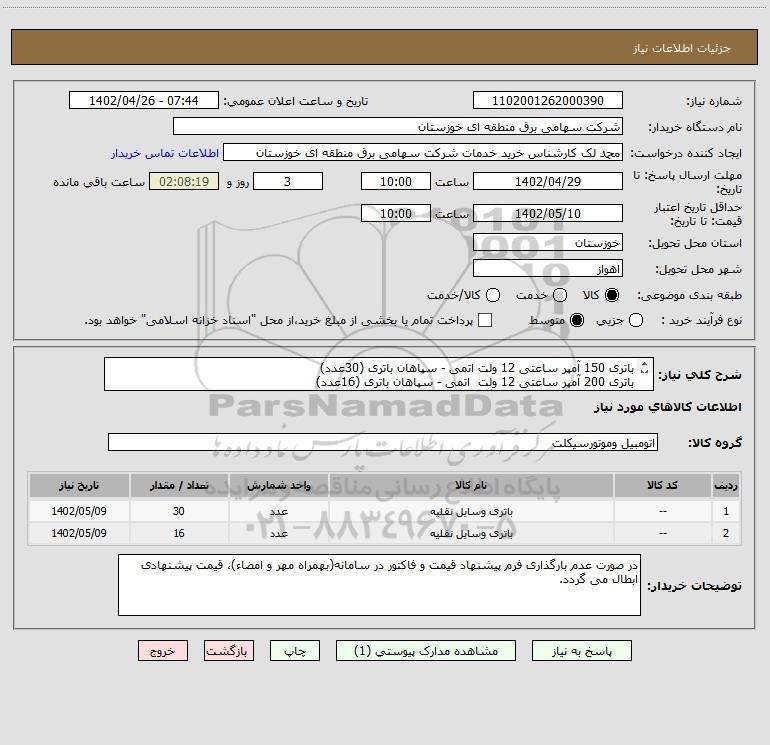 | 1 | -- | باتری وسایل نقلیه | عدد | 30 | 1402/05/09 |