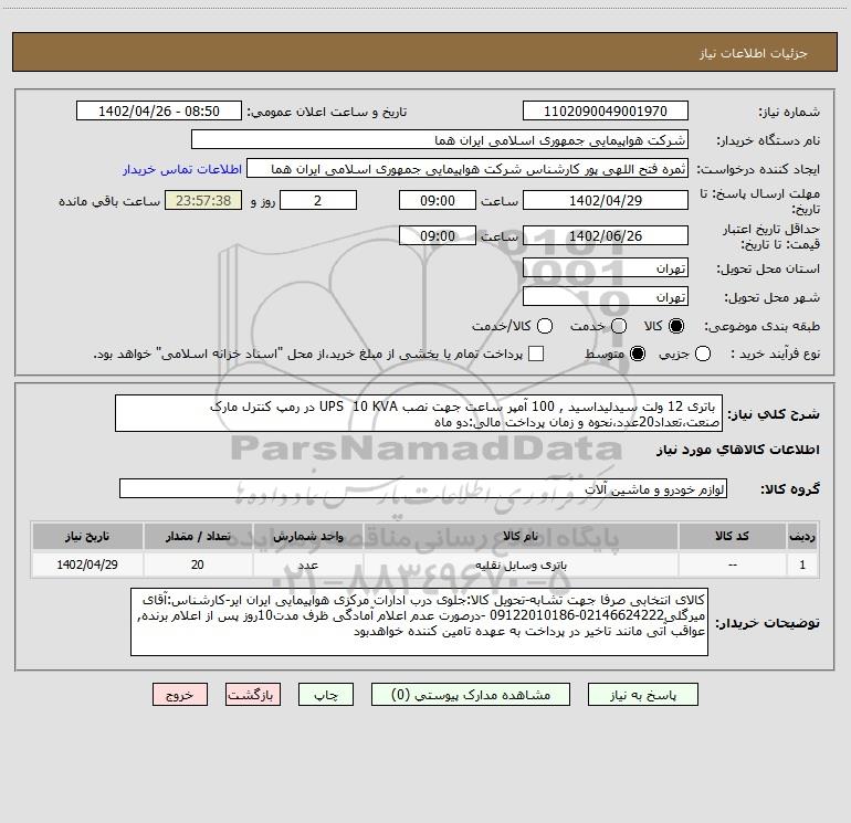 استعلام باتری 12 ولت سیدلیداسید , 100 آمپر ساعت جهت نصب UPS 10 KVA در رمپ کنترل مارک صنعت،تعداد20عدد،نحوه و زمان پرداخت مالی:دو ماه, استعلام باتری 12 ولت سیدلیداسید , 100 آمپر ساعت جهت نصب UPS 10 KVA در رمپ کنترل مارک صنعت،تعداد20عدد،نحوه و زمان پرداخت مالی:دو ماه