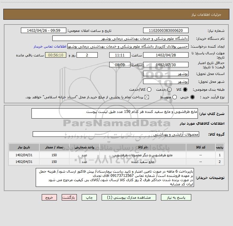 شرح کلی نیاز: مایع ظرفشویی و مایع سفید کننده هر کدام 150 عدد طبق لیست پیوست