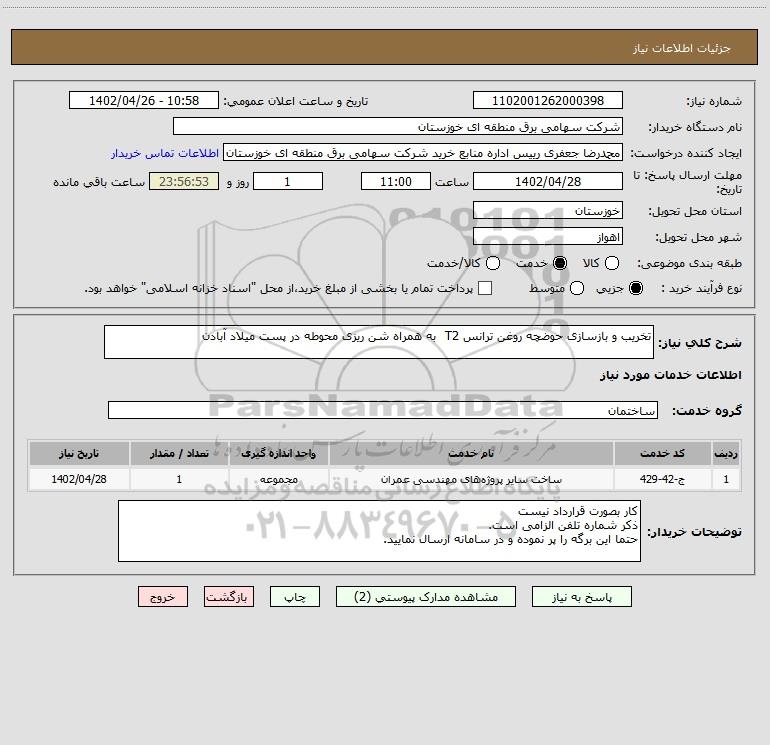 شرح کلی نیاز: تخریب و بازسازی حوضچه روغن ترانس T2 به همراه شن ریزی محوطه در پست میلاد آبادن