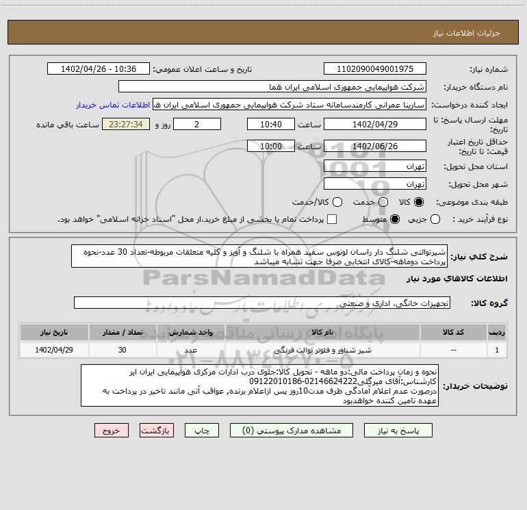 شرح کلی نیاز: شیرتوالتی شلنگ دار راسان لوتوس سفید همراه با شلنگ و آویز و کلیه متعلقات مربوطه-تعداد 30 عدد-نحوه پرداخت دوماهه-کالای انتخابی صرفا جهت تشابه میباشد