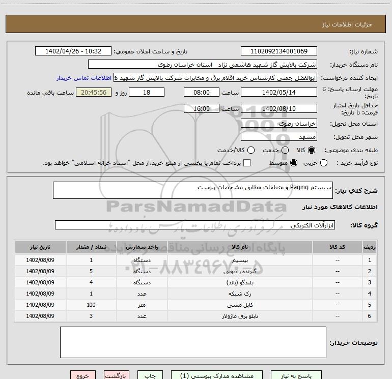 شرح کلی نیاز: سیستم Paging و متعلقات مطابق مشخصات پیوست