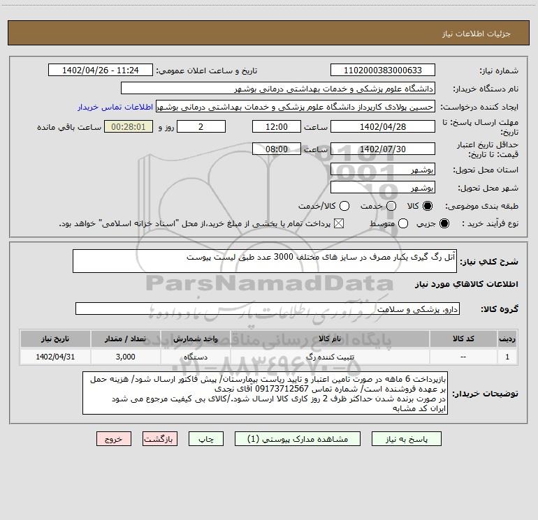 شرح کلی نیاز: آتل رگ گیری یکبار مصرف در سایز های مختلف 3000 عدد طبق لیست پیوست