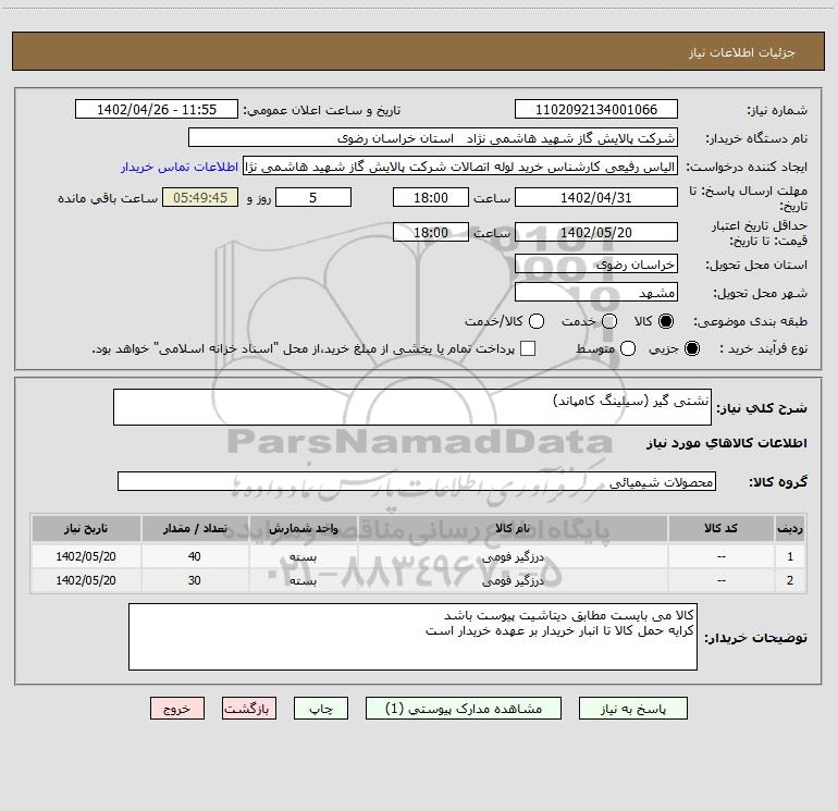 نام دستگاه خریدار:شرکت پالایش گاز شهید هاشمی نژاد استان خراسان رضوی