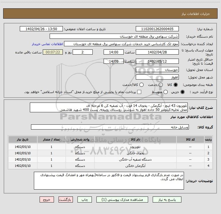 | 3 | -- | دستگاه تصفیه آب خانگی | دستگاه | 1 | 1402/05/10 |