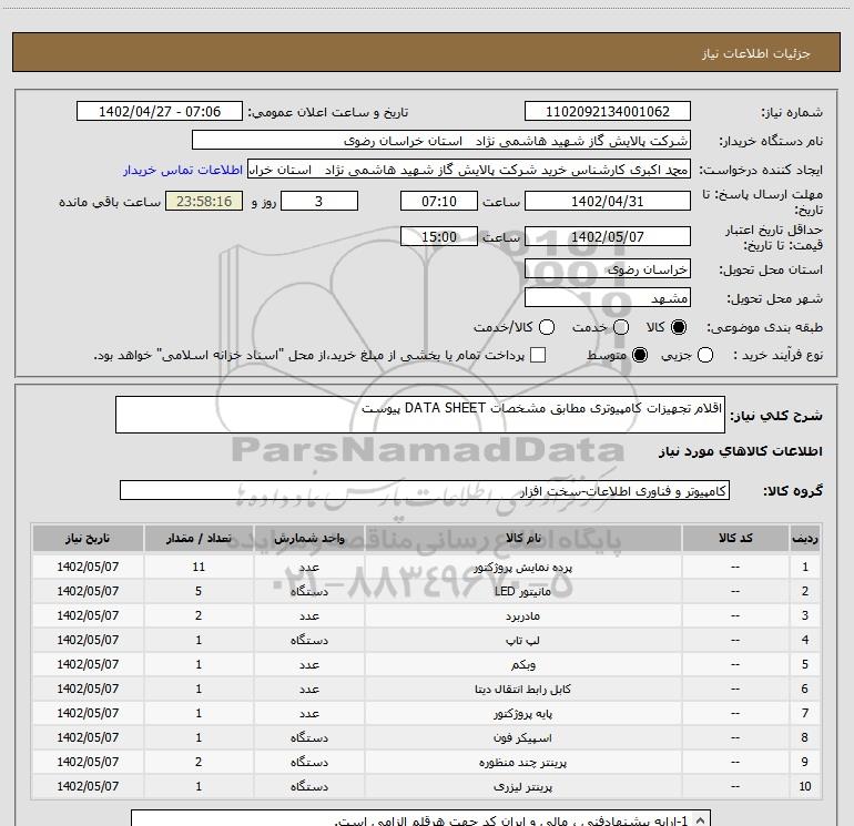 نام دستگاه خریدار:شرکت پالایش گاز شهید هاشمی نژاد استان خراسان رضوی