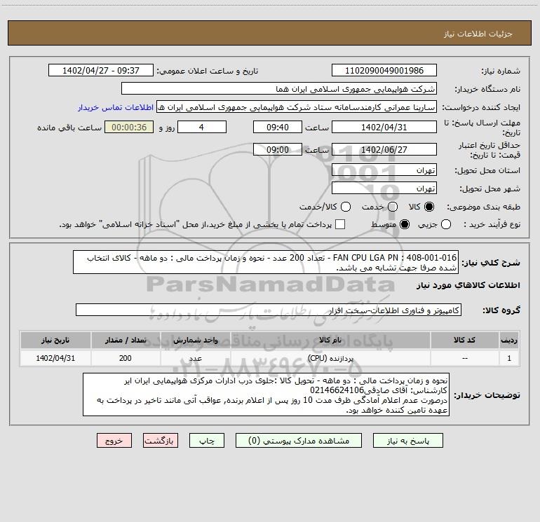 استعلام FAN CPU LGA PN : 408-001-016 - تعداد 200 عدد - نحوه و زمان پرداخت مالی : دو ماهه - کالای انتخاب شده صرفا جهت تشابه می باشد., استعلام FAN CPU LGA PN : 408-001-016 - تعداد 200 عدد - نحوه و زمان پرداخت مالی : دو ماهه - کالای انتخاب شده صرفا جهت تشابه می باشد.